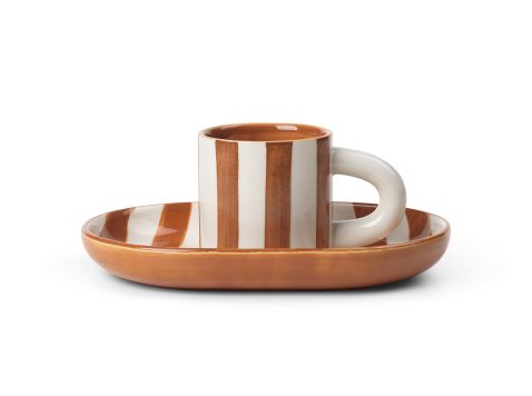 Набор посуды Milu Snack станет идеальным спутником для перекуса. Набор состоит из чашки и овальной тарелки, изготовленной из глазурованной керамики с расписанными вручную полосками. Набор также подходит для использования детьми. Объем чашки – 160 мл.